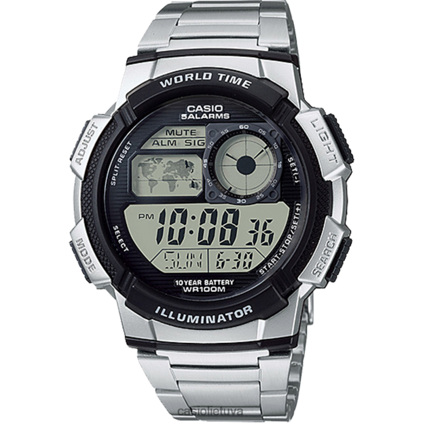10 metų baterijos veikimo laikas primena orlaivio kabinos prietaisų pasaulio žemėlapį, skirtą pasaulio laiku LCD analoginiam ekranui (namų miesto laiku) 100 metrų atsparumu vandeniui