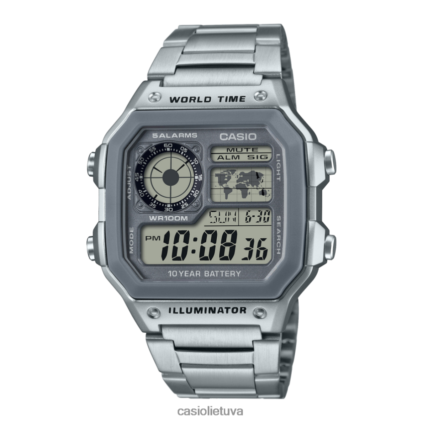 10 metų baterijos veikimo laikas 1/100 sekundžių chronometras pasaulio žemėlapis pasaulio laikui 5 signalai LED lemputė 100 metrų atsparumas vandeniui