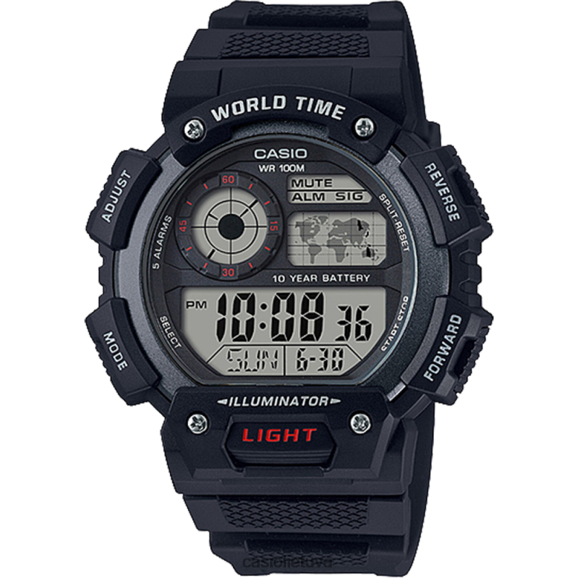 10 metų baterijos veikimo laikas 100 metrų atsparumas vandeniui 10 metų akumuliatoriaus veikimo laikas chronometras 5 signalai LED lemputė pasaulio žemėlapis pasaulio laikui LCD analoginis ekranas (namų miesto laikas)