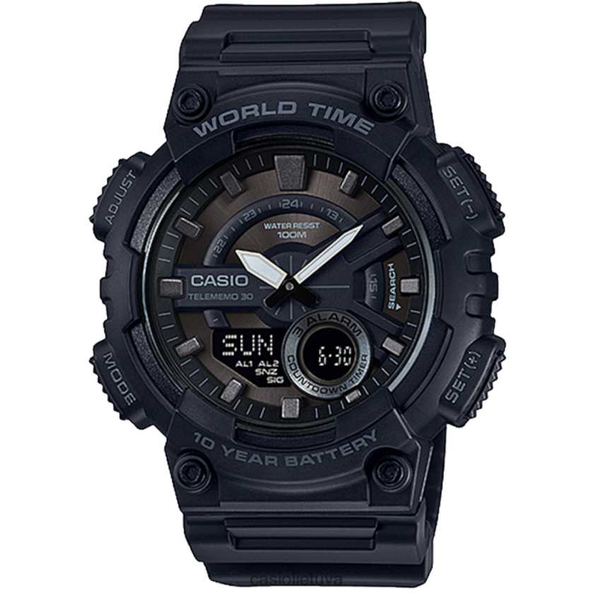 10 metų baterijos veikimo laikas ir pasaulio laikas 100 metrų atsparumas vandeniui monotoniškas metalinis 3D ciferblatas telememo 30 1/100 sekundės chronometras, 3 kasdieniniai signalai