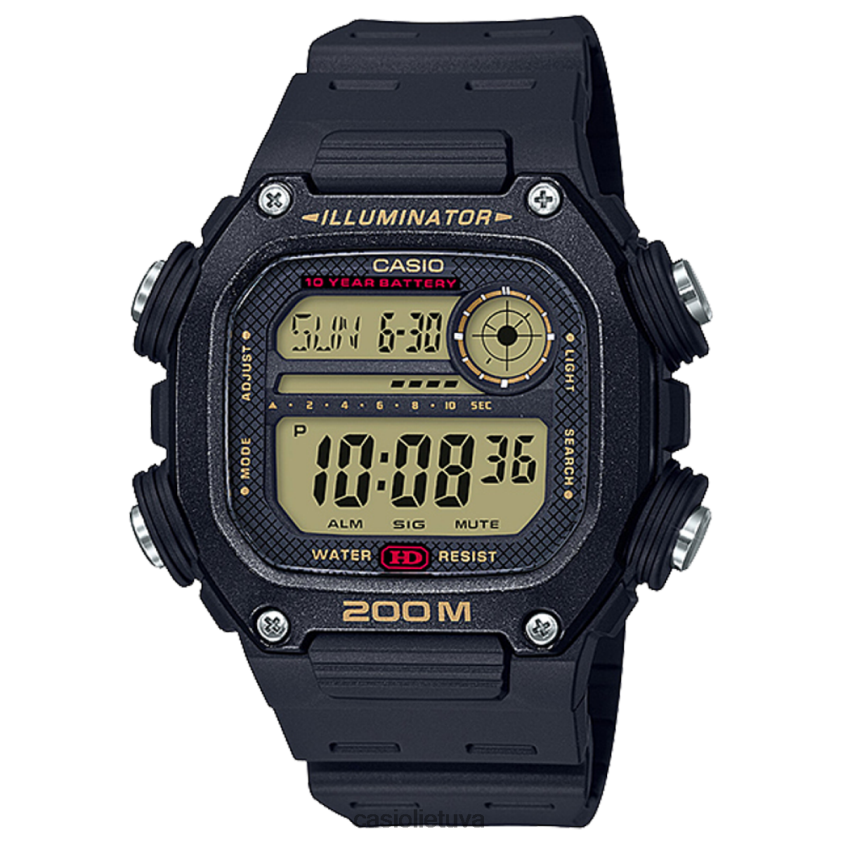 10 metų baterijos veikimo laikas 200 metrų atsparumas vandeniui LED lemputė 1/100 sekundžių chronometras pasaulio laikas 5 kasdieniai signalai