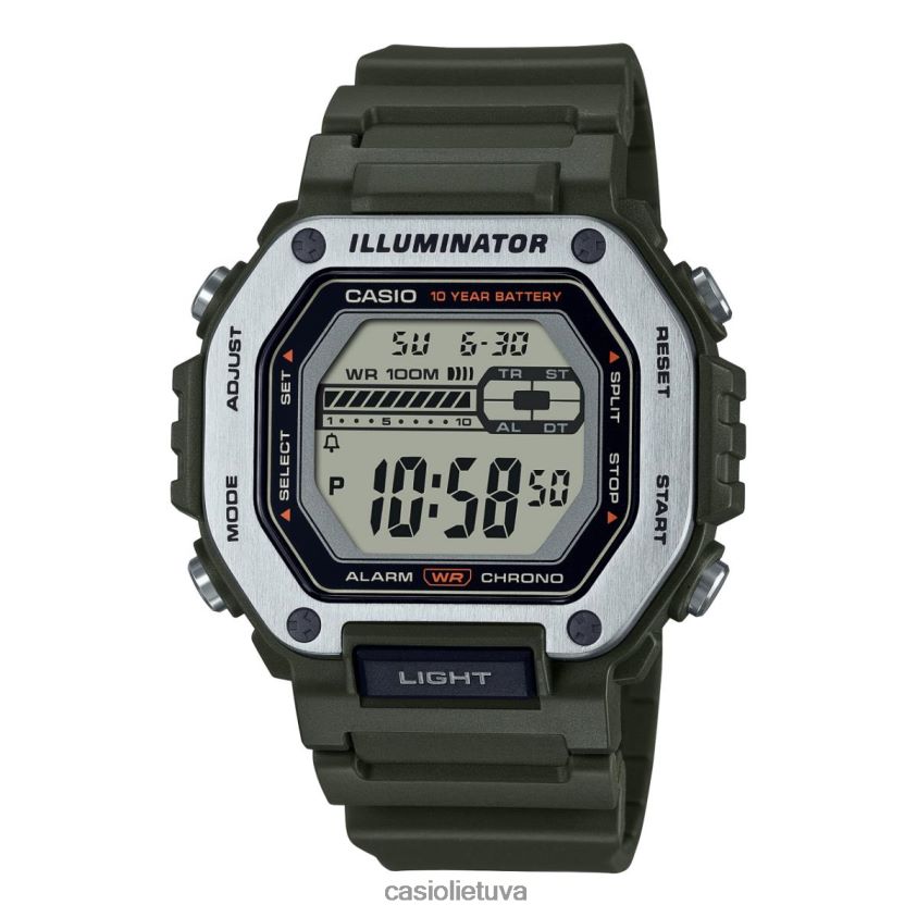 pristatome naują mwd110h seriją. ši serija turi g-shock 5000 įkvėptą dizainą su dervos dėklu, nerūdijančio plieno rėmeliu ir dervos juostele. dar viena stipri serija, kurią galite papildyti savo kasdienių laikrodžių kolekciją, ypač jei ieškote patvaraus ir 10 metų veikiančio baterijos laikrodžio. Mūsų mwd110h-3av yra žalias nerūdijančio plieno laikrodis, kuris užtikrina 100 metrų atsparumą vandeniui ir 10 metų akumuliatorinis laikrodis. Šis standartinis „g-shock“ žalias skaitmeninis laikrodis turi akį traukiantį kampinį metalinį rėmelį. jo nerūdijančio plieno korpusas ir dervos juosta užtikrina atsparumą įbrėžimams ir vandens pažeidimams. Šis elegantiškas juodas dizainas ir lengvai skaitomas ekranas yra žalias skaitmeninis laikrodis, kuris yra puikus pasirinkimas visiems, ieškantiems funkcionalaus laikrodžio, kuris atlaikytų kasdienio naudojimo sunkumus. Šiame „Casio Green“ skaitmeniniame laikrodyje taip pat yra mygtukas 6 valandos padėtyje, todėl lengva pasiekti LED lemputę esant prastam apšvietimui. mwd110h-3av taip pat turi daug patogesnių funkcijų, įskaitant stopwatch, atgalinės atskaitos laikmatis, žadintuvas ir dvigubas laiko rodymas. Apskritai mwd110h-3av yra puikus pasirinkimas „Casio Green“ skaitmeniniam laikrodžiui, kurį galima nešioti kasdien, kuris yra patvarus ir funkcionalus.