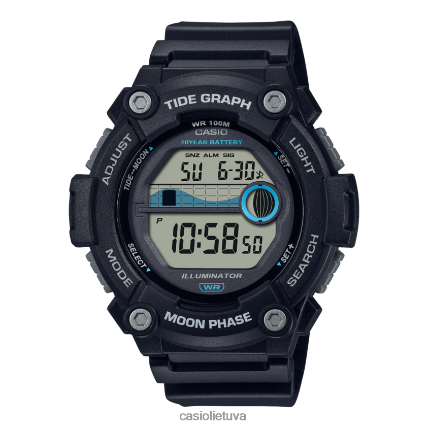Vandens mėgėjai atkreipkite dėmesį! idealus kompanionas kiekvienam jūrinio sporto mėgėjui. Ws1300h-1av prasideda nuo patvarios juodos dervos išorės dizaino, 100 metrų atsparumo vandeniui ir 10 metų baterijos veikimo laiko. tada pridėkite įmontuotą potvynio grafiką, mėnulio duomenis ir LED lemputę, užtikrinančią lengvą skaitymą net ir tamsoje, kad viskas, ko reikia vandens sporto entuziastui, būtų po ranka. Su chronometru, laikmačiu ir žadintuvu šie universalūs laikrodžiai nuves jus. sklandžiai iš namų ar biuro į baseiną ar vandenyną.