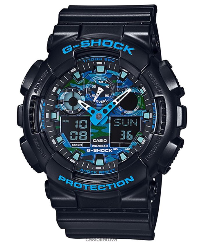 G-Shock, tvirtų laikrodžių, kurie nuolat tobulėja siekiant begalinio stiprybės, šis modelis sujungia populiarų mėlyną atspalvį su prekės ženklo spalvos juodu pagrindu. visam kūnui naudojama prislopinta pusiau matinė juoda spalva. mėlyna naudojama spalvotoms rėmelio, ciferblato ir valandų bei minučių rodyklių dalims, kad būtų sukurtas intensyvus ir šaunus dizainas. Be to, ciferblatas turi mėlyną kamufliažinį raštą, o kiekvienos detalės dizainui buvo skiriamas kruopštus dėmesys. šaunios spalvos modelis, puikiai atspindintis kasdienės mados sceną.