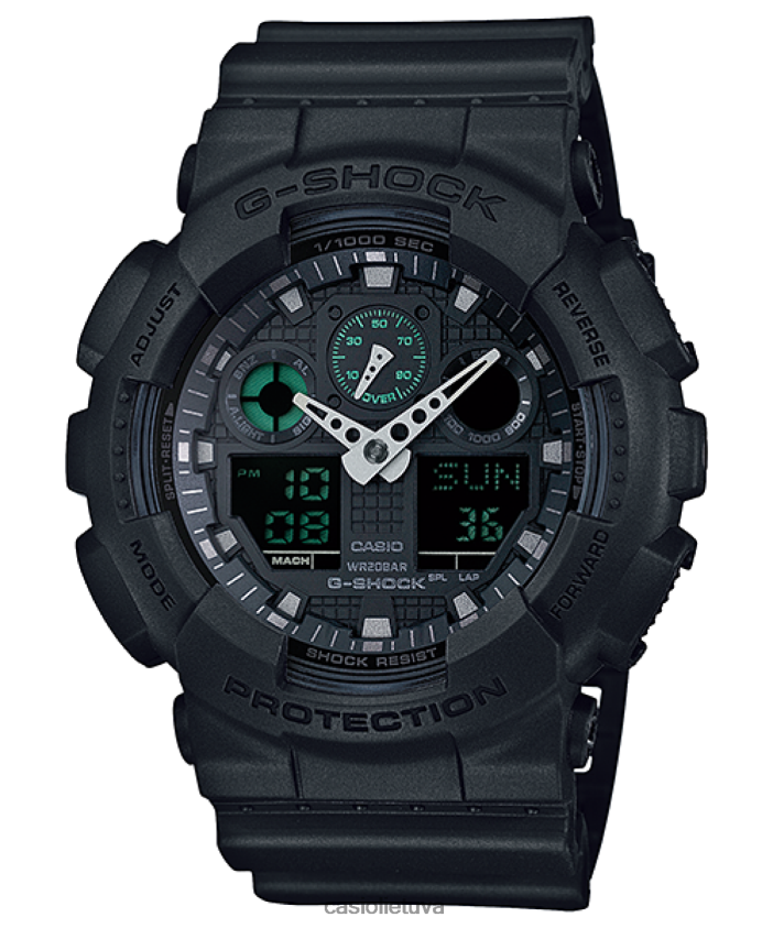 G-shock populiariausia didelio dėklo analoginė / skaitmeninė serija pristato matinės juodos spalvos laikrodį ga100mb-1a. veidas ir juosta yra matinės juodos spalvos su žaliais akcentais, kurie pabrėžia g-shock tvirtumą ir vėsumą.