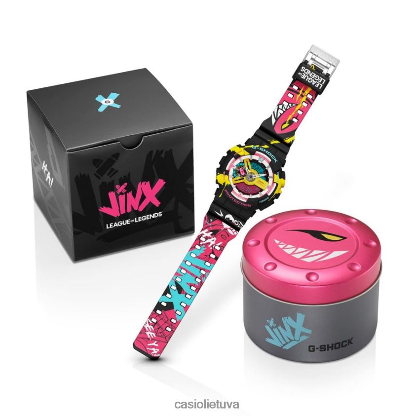 pasiruoškite įspūdingam bendradarbiavimui, kuris sujungia g-shock su stulbinančiu pasauliniu internetiniu žaidimu League of legends. Mes pradedame nuo tvirto ga110 ir įtraukiame populiarią ir charizmatišką legendų lygos čempioną Jinx tiesiai į veiksmą . Drąsiai atspausdintas ryškiomis spalvomis, dangtelis ir juosta primena laukinę sėkmę ir jos išskirtinį ginklą – super megadeath raketą. Šis žaismingas motyvas atsispindi mažoje, kaip Jinx'o raketos formos, rankoje ant įtaisyto ciferblato 9 val. sukurta atsižvelgiant į lygos gerbėjus.Apie legendų lygą, išleistą 2009 m., „League of legends“ yra riot games debiutinis titulas ir vienas dažniausiai žaidžiamų konkurencinių žaidimų pasaulyje, įtraukiantis milijonus žaidėjų kasdien daugiau nei 20 oficialiai palaikomų kalbų. Moba žanro ramstis, lygoje, dvi komandos iš penkių galingų čempionų susiduria su sunaikinimujos bazė žaidime, kuriame rts greitis, strategija ir intensyvumas derinamas su įtraukiančiomis RPG elementais.