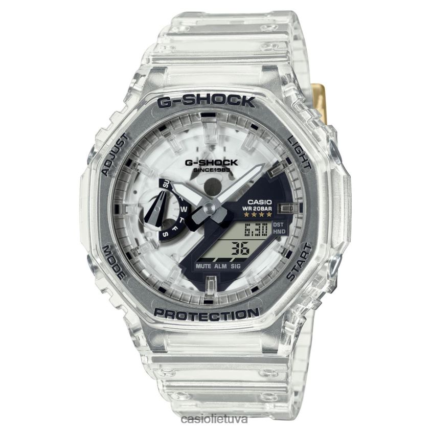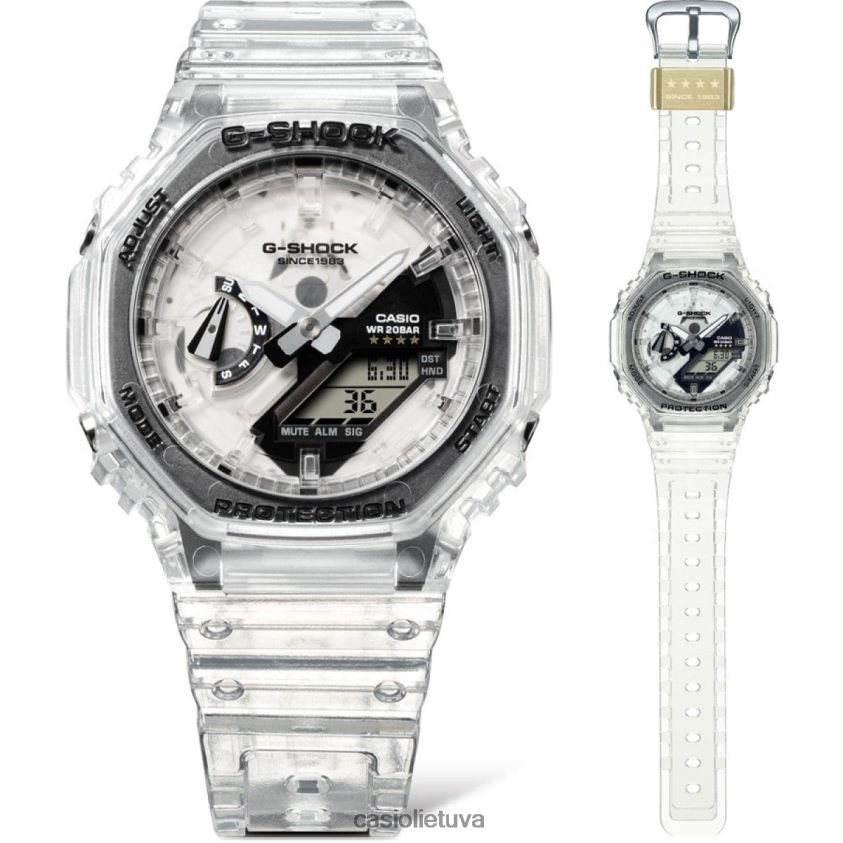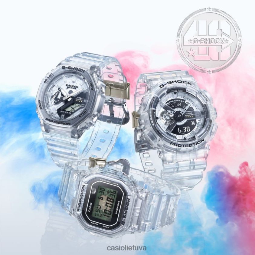 Išreikškite save neabejotinai naudodami „g-shock“ 40-mečio aiškų remiksų asortimentą – populiarūs „g-shock“ dizainai, dekonstruoti naudojant permatomus komponentus, kad vaizdas būtų kuo aiškiausias. Permatomos apyrankės medžiagos, dėklas, ciferblatas, LCD , o mygtukai suteikia modulio pagrindo, atspausdinto g ženklu ir g-shock logotipu, užkulisių vaizdą. Dėklo nugarėlėje yra 40-asis erico miglos sukurtas logotipas, o juostos kilpoje išgraviruotos keturios žvaigždės, primenančios šią ypatingą sukaktį. Šios detalės ir pirmą kartą panaudotas permatomas dėklas, pagamintas iš skaidraus stiklo pluošto diamido, suteikia išskirtinį dizainą, vertą išskirtinio riboto leidimo g-shock. Naujoji serija apima laikrodžius, sukurtus pagal kelis ikoninius g-shock laikrodžius: pats pirmasis g-shock, dw-5000; klasikinis skaitmeninis dw-5600; dw-6900 su išskirtiniu priekinio mygtuko dizainu; arba ga-2100/gma-s2100 arba ga-110/gma-s110, kuriuos galima nešioti atskirai arba kaip atitinkamo rinkinio dalį. Permatomas dėklas: dw-6940rx, ga-114rx, gma-s114rx-through ciferblatas: dw-6940rx, ga-114rx, gma-s114rx, ga-2140rx, gma-s2140rxsee-through lcd*: mygtukas dw-5040rx, 4-dx 4-rx, 4-0rx ga-114rx, gma-s114rx* skaitmeninį ekraną gali būti sunku perskaityti tam tikrais žiūrėjimo kampais dėl skystųjų kristalų ekranui naudojamų permatomų medžiagų.