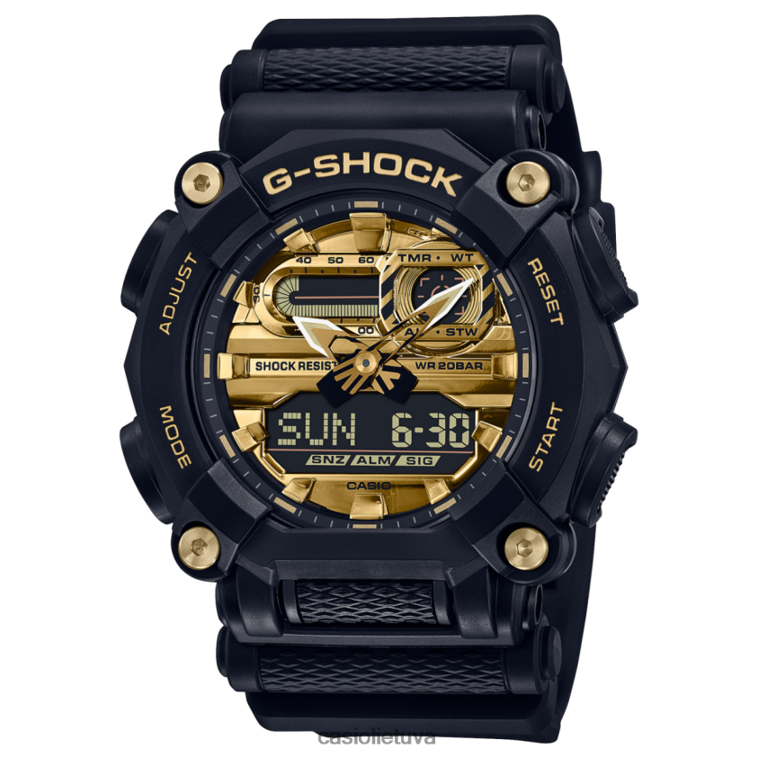 Pristatome juodą su auksiniais akcentais ga900ag-1a iš naujos g-shock ryškių spalvų serijos. 10 pusių rėmelis primena didelę veržlę pramoniniam motyvui. jis pritvirtintas keturiais gerai matomais varžtais. Šių modelių rodyklės ir ciferblatai padengiamos ryškiomis spalvomis naudojant metalinį garų nusodinimą, kad būtų sukurti ryškūs vaizdai. neslystantis langelis ant priekinio mygtuko ir funkciniai mygtukai prisideda prie geresnio veikimo. juosta taip pat turi languotą raštą. šie nauji g-shock modeliai siūlo puikų tvirtumo ir madingumo derinį.