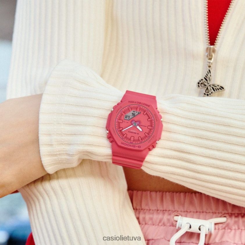 Mėgaukitės vis populiarėjančia skaitmenine analogine g-shock išvaizda, patogiau nei bet kada anksčiau. gmap2100 turi ir taip kompaktišką gmas2100 dizainą, todėl jis yra dar plonesnis ir kompaktiškesnis, o juostos ilgis taip pat trumpesnis, kad tilptų mažesni riešai su visišku komfortu. Monochromatinė ryškių spalvų apdaila – dinamiška turkio mėlyna (nauja spalva), ryškiai rožinė ir klasikinė balta – pakelia nuotaiką, o 9 val. įdėtas ciferblatas iš originalaus gmas2100 paliekamas supaprastintam, minimalistinė išvaizda. Stilingas, bet praktiškas laikrodžio ciferblatas turi ciferblatą, logotipą, rodyklės žymes, rodykles ir kitus komponentus, pagamintus skirtingų tos pačios spalvos atspalvių, tuo pačiu metu išryškinančius rafinuotumą ir užtikrinantį lengvą skaitymą. Šių laikrodžių rėmelis ir apyrankė yra pagamintas iš biologinės dervos, pagamintos iš atsinaujinančių organinių išteklių – medžiagos, kuri, kaip tikimasi, padės sumažinti CO2 išmetimą ir kitaip sumažinti poveikį aplinkai.