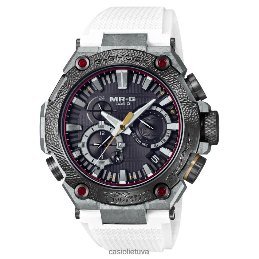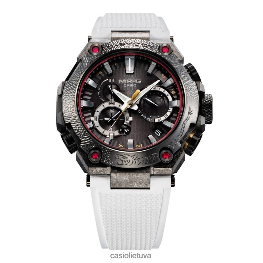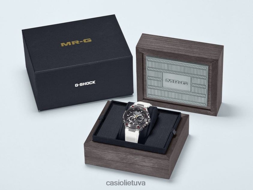 Prisijunkite prie g-shock 40-mečio šventės prabangiai ir stilingai naudodami riboto leidimo laikrodį iš pavyzdinio g-shock mr-g serijos laikrodžių, pagerbančių amatininkų amatus. Skirta tradicinėms japonų amatininkų technikoms, perduodamoms per šimtmečius. laikrodis švenčia samurajų kario pasididžiavimą ir estetiką su dizainu, kuriame yra shougeki-maru: gai, kabuto šalmo casio, sukurtas mr-g linijai. dangtelis užfiksuoja šio labai ypatingo šalmo maedato keterą su tigro dizainu ir uolos grūdelių reljefu, kurį įmantriai išgraviravo metalkalys Kobayashi masao. kiekvienas riboto leidimo laikrodis yra vienetinis, ranka išgraviruotas meistro.Grynai balta kieta minkšta fluoro gumos juosta primena balto ito odoshi1, naudojamo kuriant tradicinius japoniškus šarvus, išvaizdą. Perkristalizuoto titano korpusui taikomas gilaus sluoksnio kietėjimo procesas ir tamsiai sidabrinis aip, kad išreikštų shougeki-maru: gai šalmo spalvą. graviruota metalinė plokštelė cminint g-shock 40-ąsias metines korpuso pusėje ties 10 val., suteikiama ryškaus stiliaus detalė, kaip ir keturi laboratorijoje išauginti rubinai2 rėmelyje, simbolizuojantys 40 metų. Šis laikrodis yra daugiau nei tik pagarba tradicijoms. taip pat suteikia puikų šiuolaikinį funkcionalumą. Laikrodis su „Bluetooth“ ryšiu, kad būtų galima prisijungti prie išmaniojo telefono, laikrodis prisitaiko prie radijo bangų laiko signalų, kad būtų galima tiksliai skaičiuoti laiką, ir pateikiamas su patogiomis funkcijomis, kurias palaiko originali „casio“ technologija. Šis ypatingas, 40-ies metų jubiliejaus vertas „mr-g“ švenčia ir tradicinį meistriškumą, ir šiuolaikines technologijas. Japonijos – viskas viename samurajų įkvėptame laikrodyje. 1 balta ito odoshi: balta virvelė, sujungianti Shikoro šarvų plokštes. gryna balta spalva simbolizuoja tvirtą kario ryžtą, kuris lieka ištikimas savo įsitikinimams, nepaveikiamas kitų (kaip ir balta, nedažyta kitų spalvų). 2 dangtelį tvirtinančių varžtų galvutės padengtos laboratorijoje išaugintais rubinais by kyocera – medžiaga, parinkta atsidavus etiniams sumetimams. Nuo seniausių laikų rubinai buvo žinomi kaip „pergalės akmuo“ ir buvo manoma, kad jie neša triumfo prieš sunkumus ir pergalę energiją.